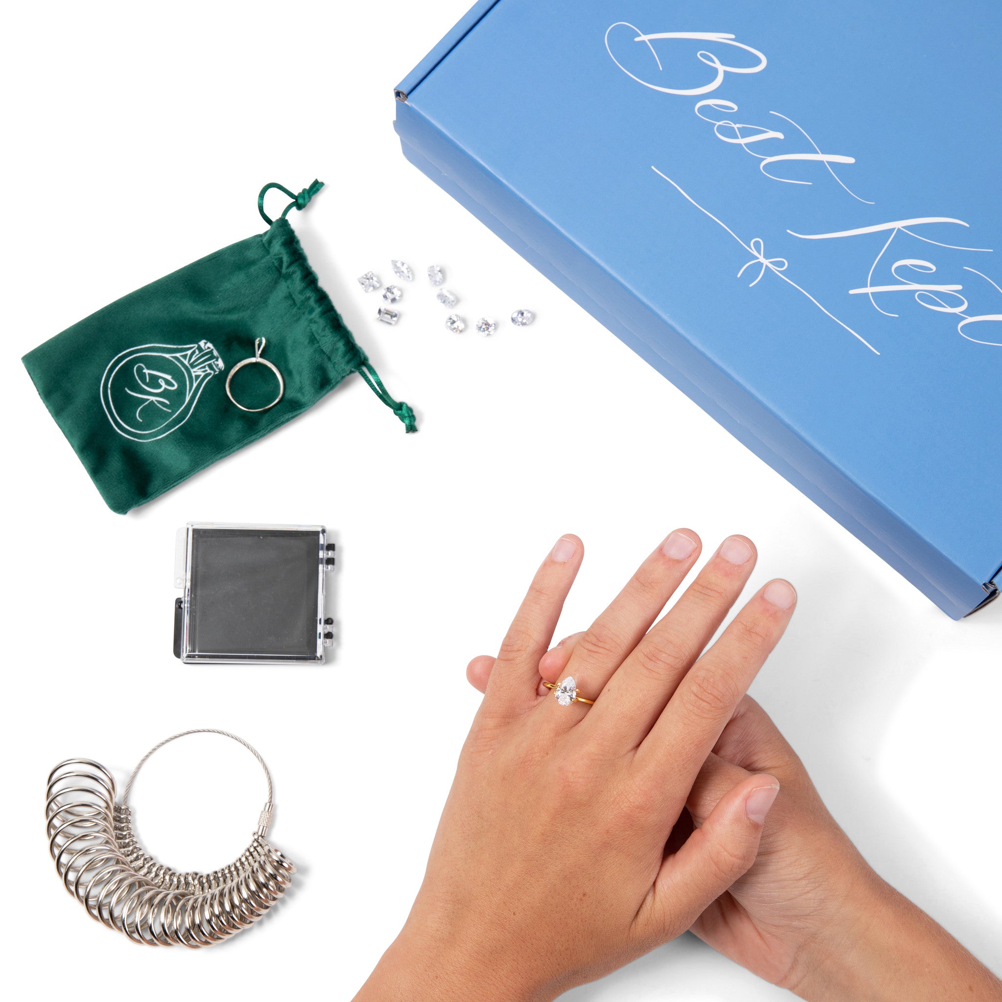 Featuring 5A cubic zirconia in ten diamond shapes, each tool helps you see how different carat sizes actually look on the hand.